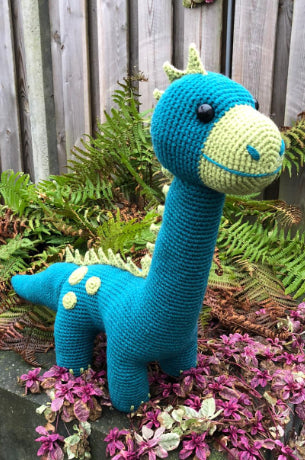 Huggy the Hugasaurus is a cuddly, huggable dinosaur perfect for little ones (and big dino-fans too!). Made with soft velvet yarn, Huggy is sure to be a favorite cuddle companion.