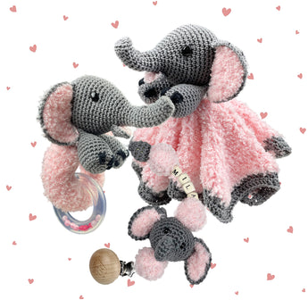 Amigurumi Baby Set Elephant is a great handmade maternity gift for a (future) little one and consists of 3 parts: a soft cuddle cloth, a soft rattle, and a pacifier cord in an elephant theme. Our elephant set is made of Softy Scheepjeswol, available in many colors. Which color are you going for?