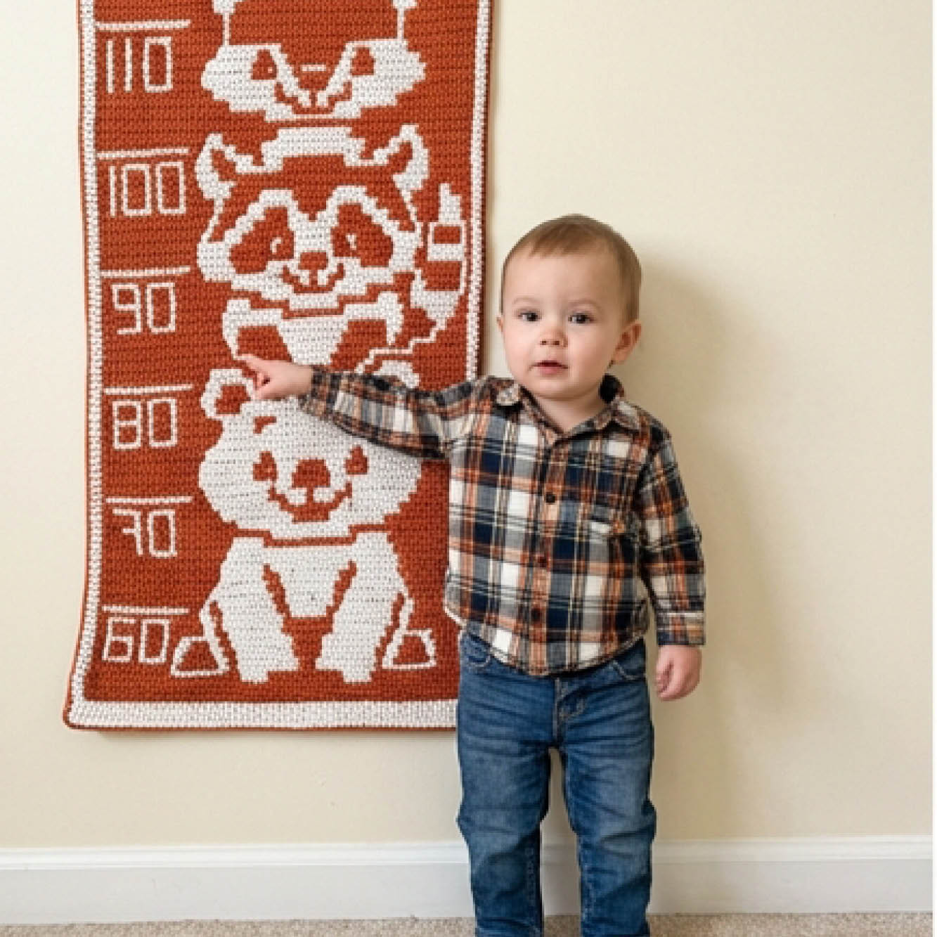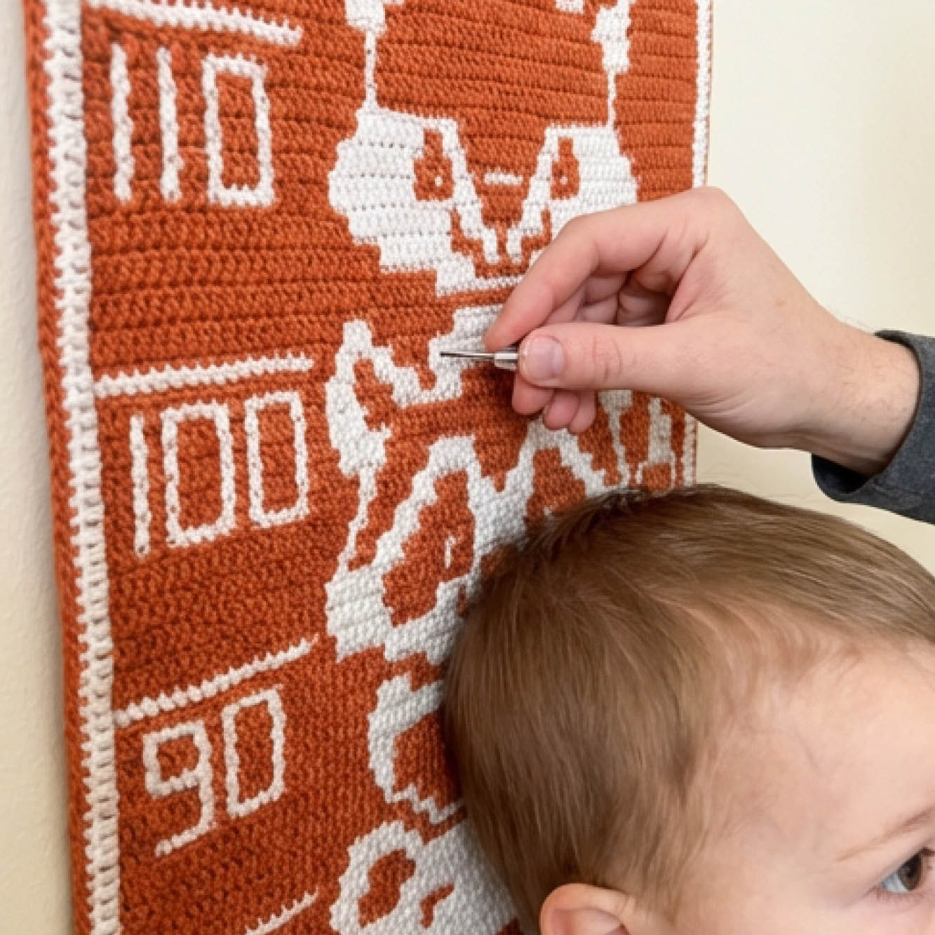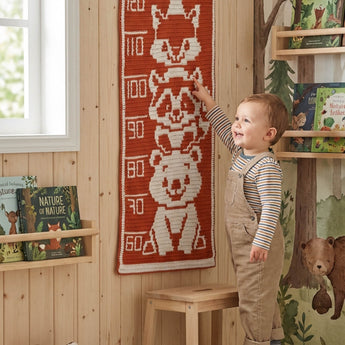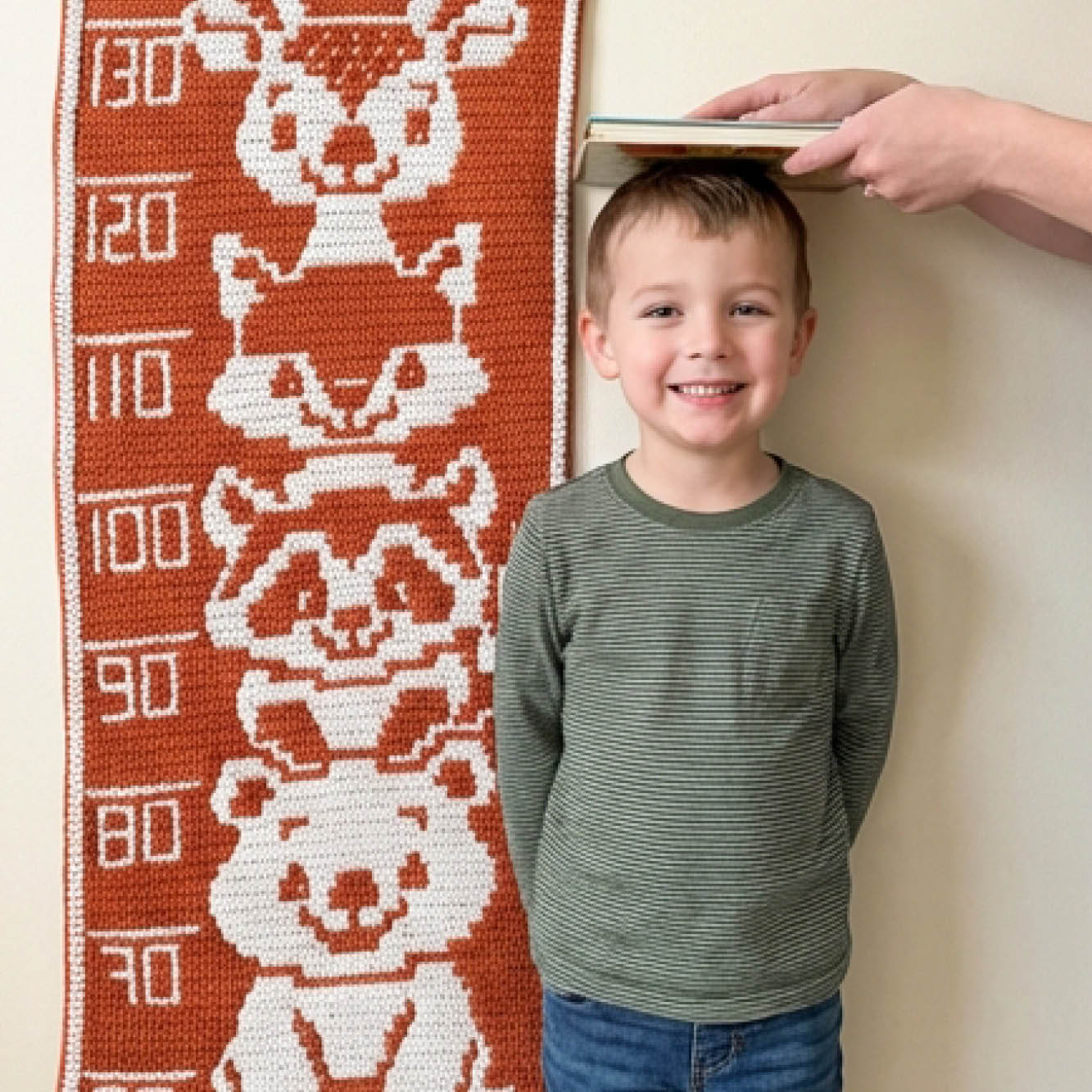 The finished crocheted piece measures approximately 35 cm wide and 85 cm high and is perfect for hanging on the wall in a child’s room. It allows you to track the height of your children or grandchildren in a playful way, year after year.