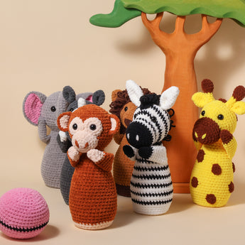 Create your very own cheerful safari bowling game with this all-in-one crochet kit! This fun and creative DIY project is perfect for crochet lovers who enjoy making soft toys with a playful twist. You'll crochet six charming safari animals – a lion, rhino, giraffe, zebra, elephant, and monkey – that double as bowling pins. Use the included ball to knock them over for a fun game, or simply display them as adorable decor in a child’s room.