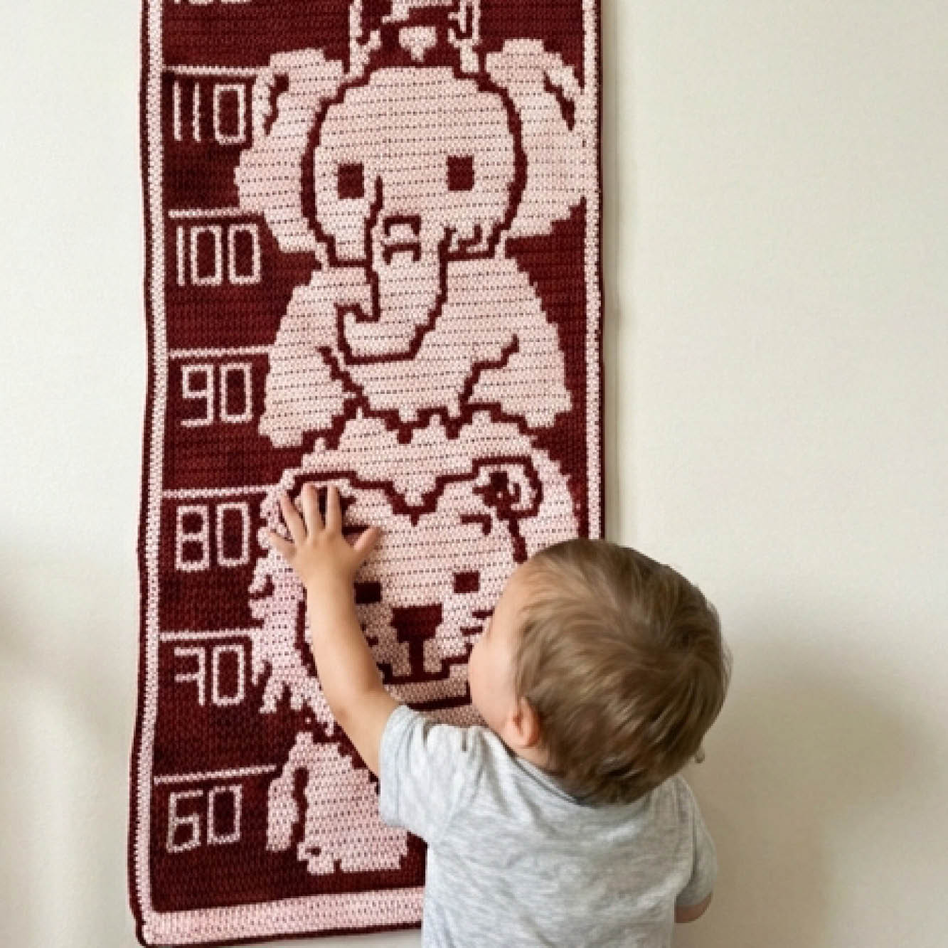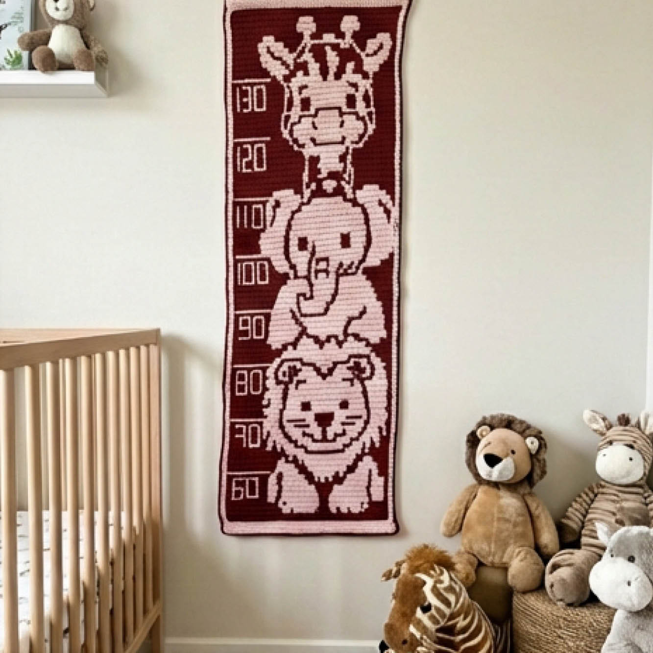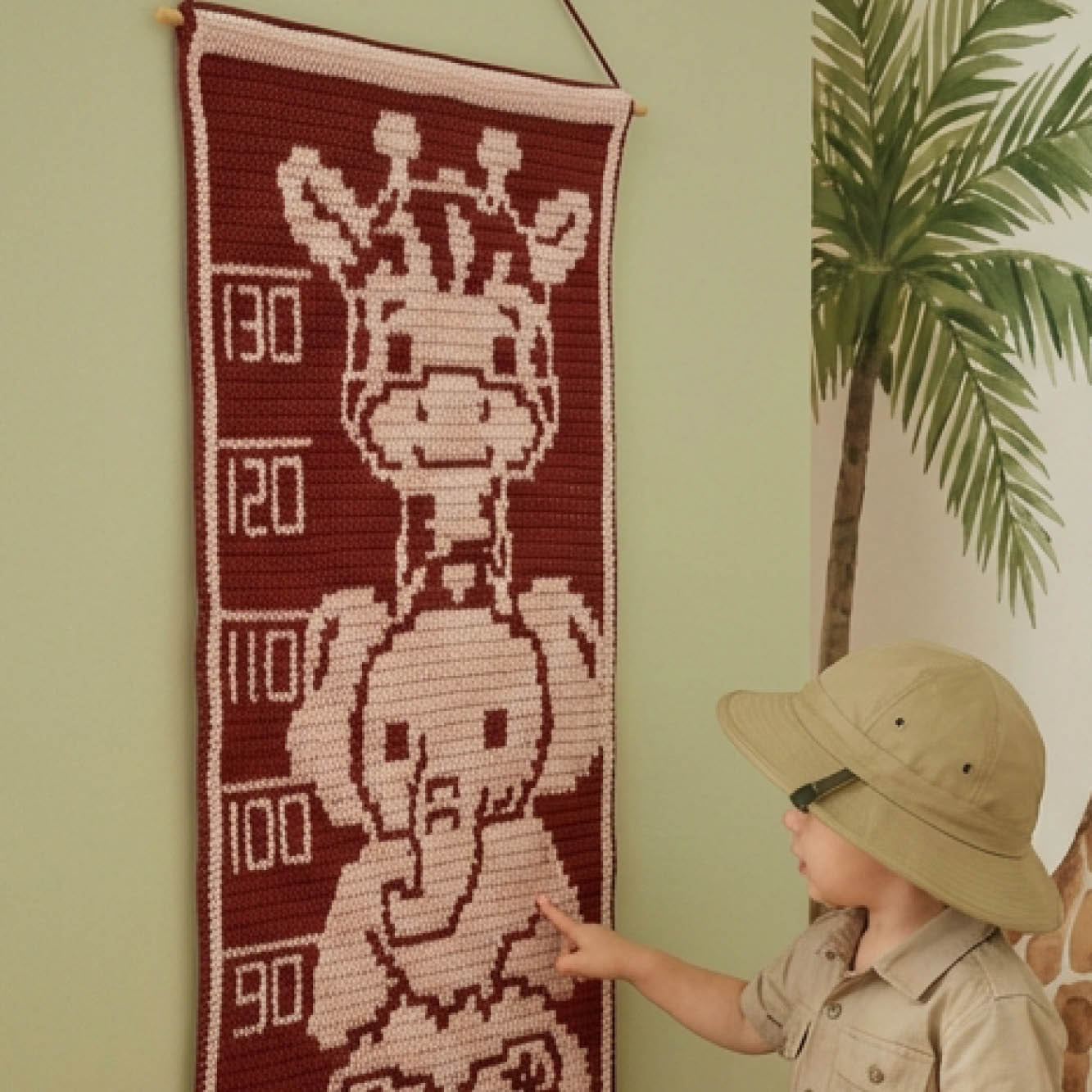 The finished crocheted piece measures approximately 35 cm wide and 95 cm high and is perfect for hanging on the wall in a child’s room. It allows you to track the height of your children or grandchildren in a playful way, year after year, surrounded by cheerful safari animals.
