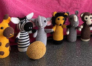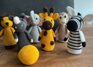 With this pattern, you will crochet 6 animal skittles and a ball. The set contains the following animals:
