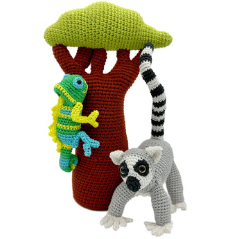 With this amigurumi pattern you will crochet a ring-tailed lemur, a colorful chameleon and a majestic baobab tree. Combine the three to create your own Madagascar scene.