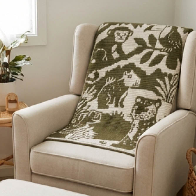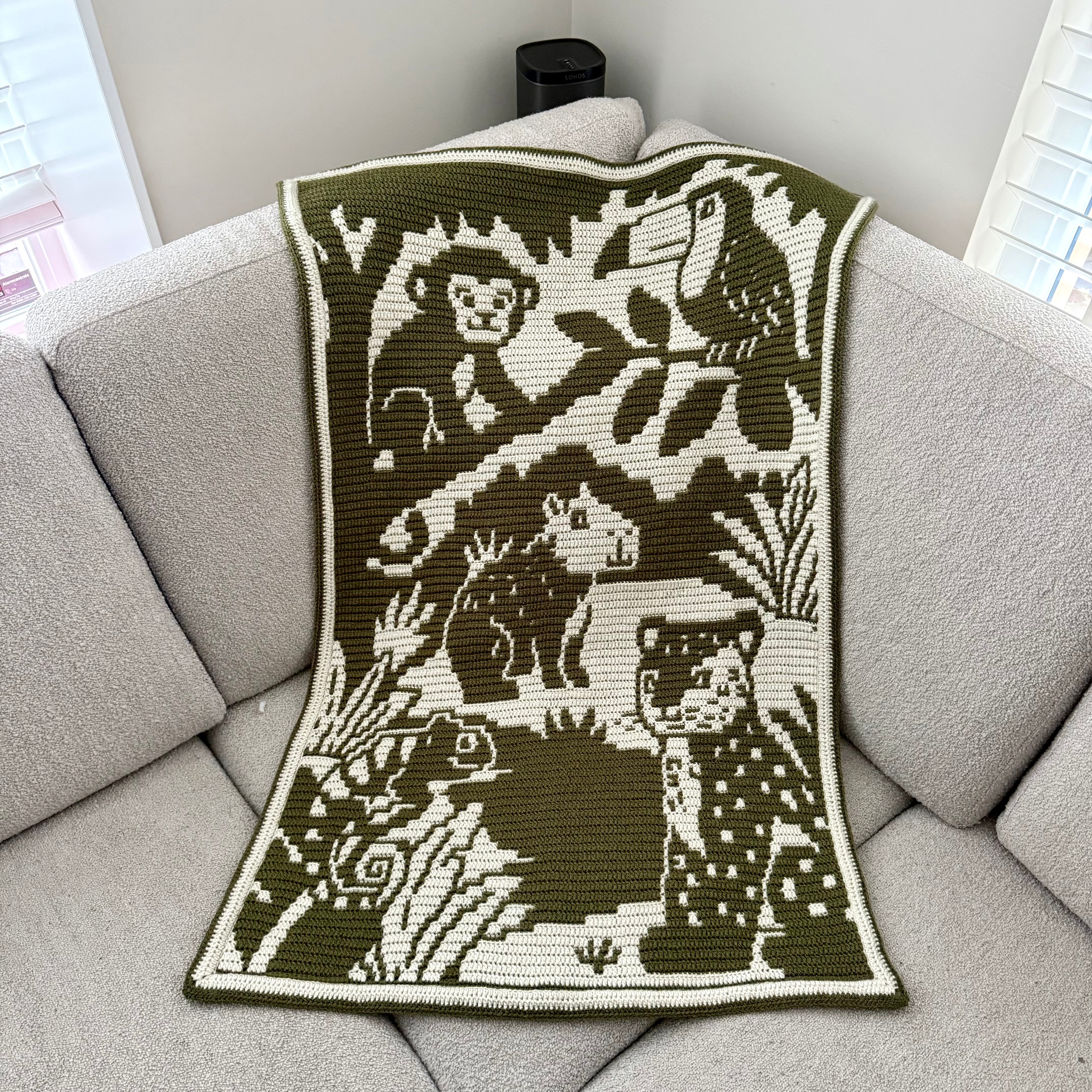 The blanket features a capybara, toucan, monkey, jaguar, and chameleon, creating a cheerful jungle scene.